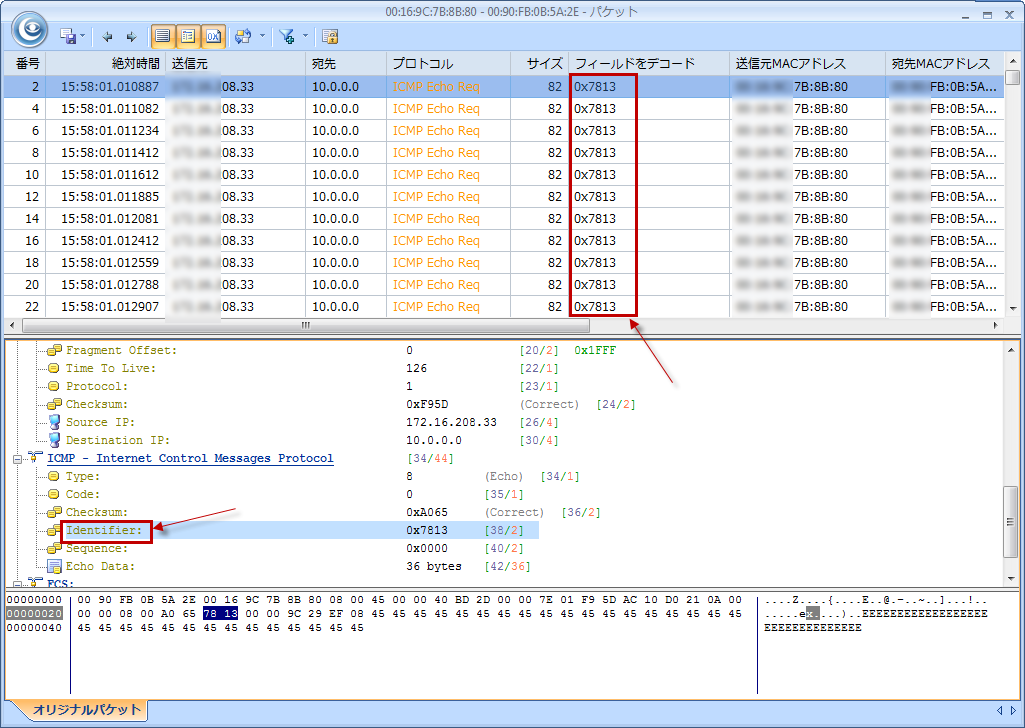5、 物理セッションをダブルクリックして、そのセッションに関するパケット情報を表示します。パケットのデコード情報が表示されていない場合、「デコードビューを表示」と「HEXビューを表示」ボタンをクリックすることで、パケットのデコード情報を表示することができます。デコードビューで「Identifier」をクリックすることで、パケットリストビューにおける「フィールドをデコード」カラムの値を確認したところ、すべてのパケットにおけるこのカラムの値は同じであることが分かります。それは、この例ではネットワークループが原因で、同じパケットがネットワーク内で継続的に転送していることを意味します。例えば、ルータAはそのパケットをルータBに送信し、そしてルータBはまたそのパケットをルータAに返送します。